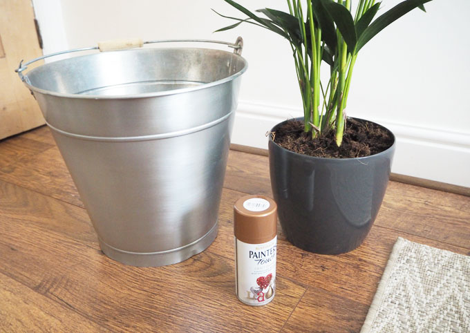 I was looking for a cool, rustic style bucket on Ebay and came across these tin pots that come in a variety of sizes. My original pot was 18cm wide so I decided to get a 28cm bucket so my plant would have plenty of room to grow. I found this copper metallic spray on Ebay too, it is great for using on plastic, wood metal or ceramics so thought it would be prefect.